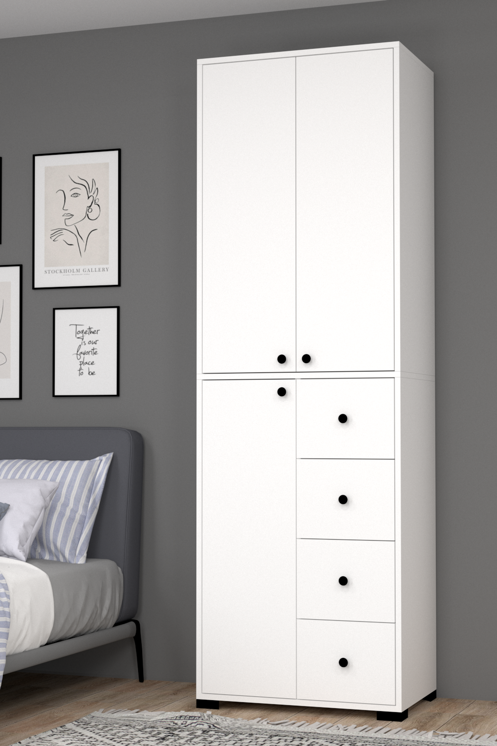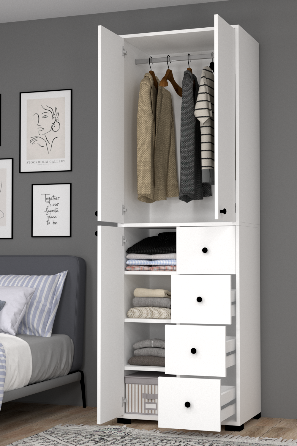 Bükreş No.2 Askılı Dört Çekmeceli Üç Raflı Gardırop